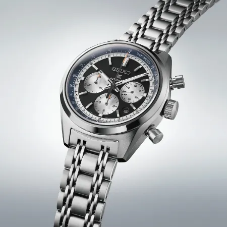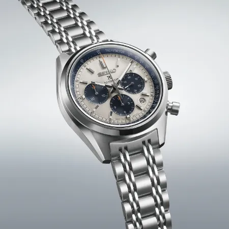 Shaped by heritage, the new timepiece inherits many of the design elements of a Speedtimer chronograph that was introduced in 1972. The flowing case design, multi-row bracelet, and highly legible panda-style dial with an orange-tipped chronograph seconds hand are all design cues inherited from the 1972 creation. The new case and bracelet are produced using Seiko’s latest watchmaking technologies, and the case and dial feature varying hairline finishing techniques to create a classic and refined presence. The multi-row bracelet is composed of fine links that provide movement while fully supporting the weight of the case to achieve comfort on the wrist.