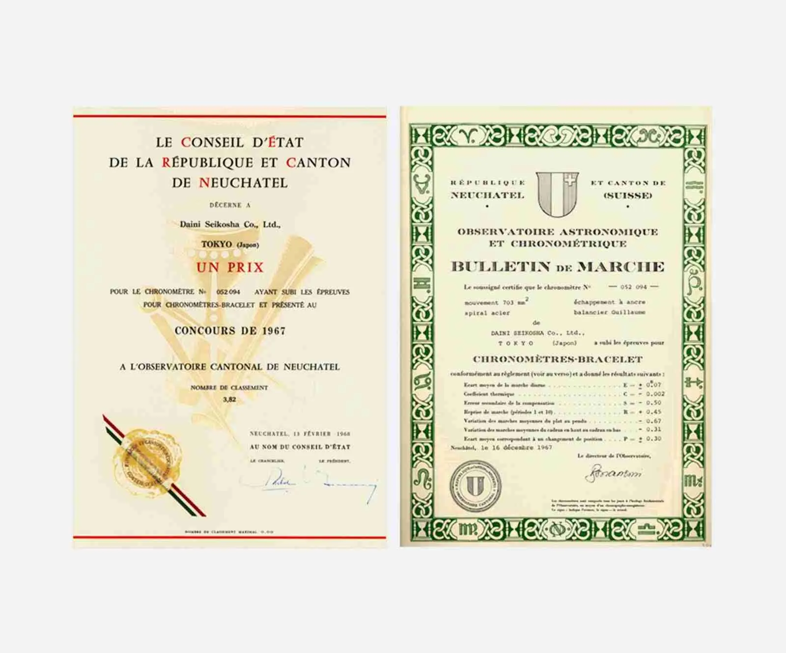 In 1967, Daini Seikosha sent to Neuchatel caliber 45 movements that were being used in the Grand Seiko and King Seiko lines, and these were subsequently marketed as special pieces that has passed the tests for “specially calibrated timepieces”. They were known as the Observatory Chronometers and these VFA Seiko watches took second and third places in the chronometer competition. This was the last year of the Neuchatel competition held under the old rules. Seiko then entered the Geneva Observatory competitions and at the very first attempt achieved a fantastic result. Seiko’s entries were awarded every place from fourth to tenth, which was the best result achieved by any manufacturer of mechanical wristwatches. Seiko achieved first place overall.
