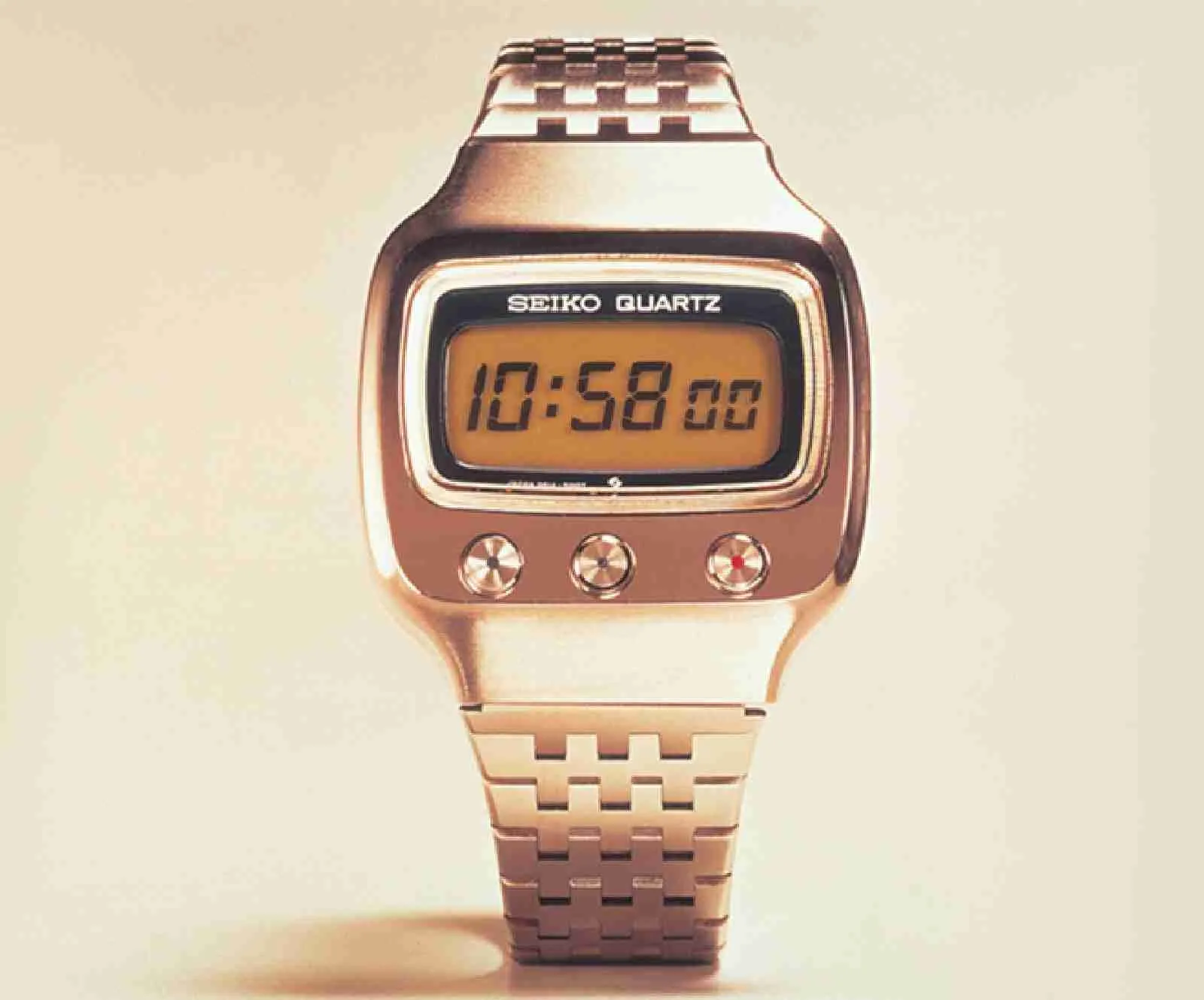 This fully-electronic watch used the world’s first six-digit liquid-crystal display to indicate the time. Capable of continuously displaying the hour, minutes and seconds on a field-effect liquid crystal display, this groundbreaking digital watch attracted wide attention when it was first marketed in October 1973. The internally developed LCD was long-lived (50,000 hours) and had good contrast. A lamp provided enough illumination to make the numbers on the display easy to read even in the dark.