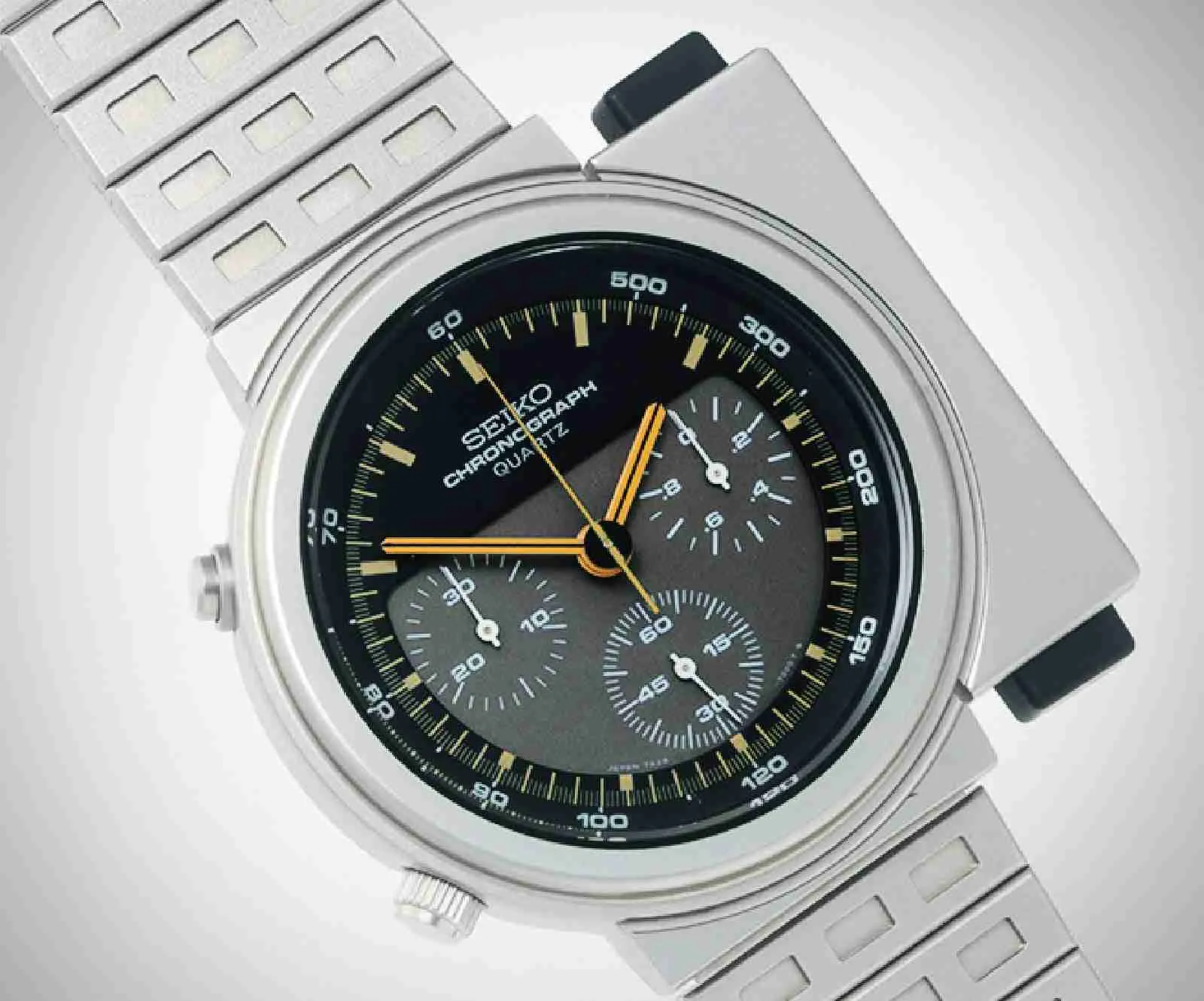 Seiko’s mastery of quartz technology and of mechanical chronograph watchmaking came together in the creation of the world’s first analog quartz chronograph. It measured elapsed time to 5/100 second and offered split time capability and a tachymeter. It was designed by the celebrated Italian car designer, Giorgetto Giugiaro