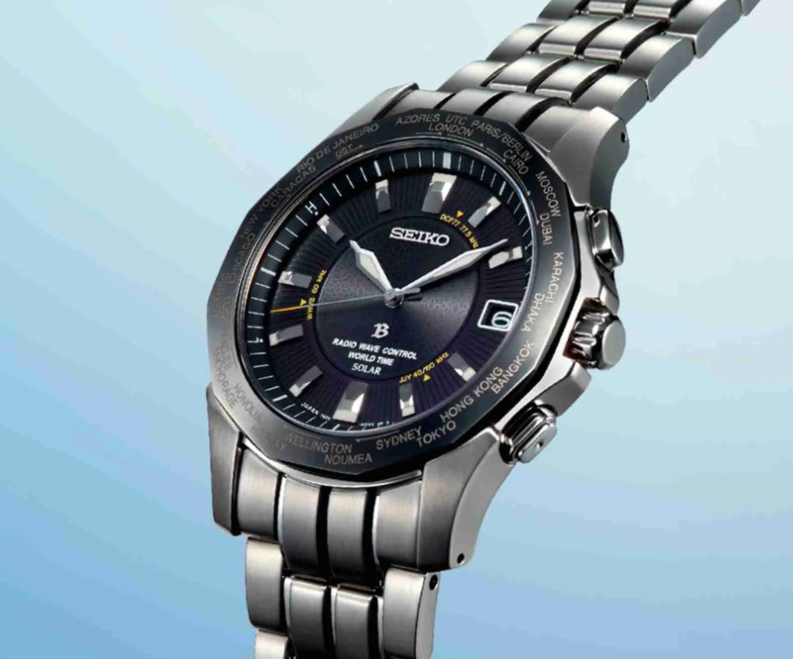 Seiko commercialized solar powered radio-controlled analog watches capable of receiving the standard wave of three countries (Japan, US and Germany), the first device of its type.