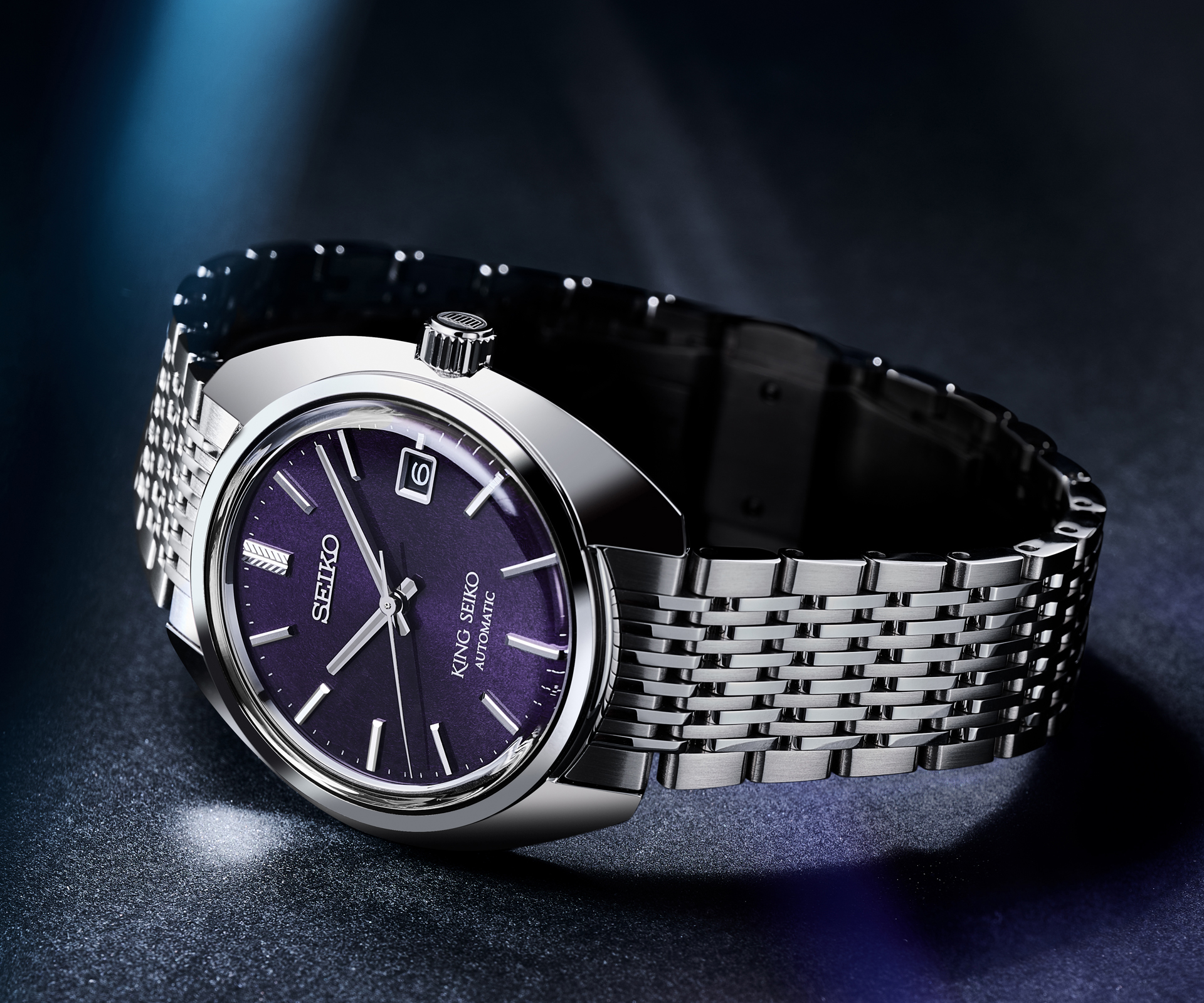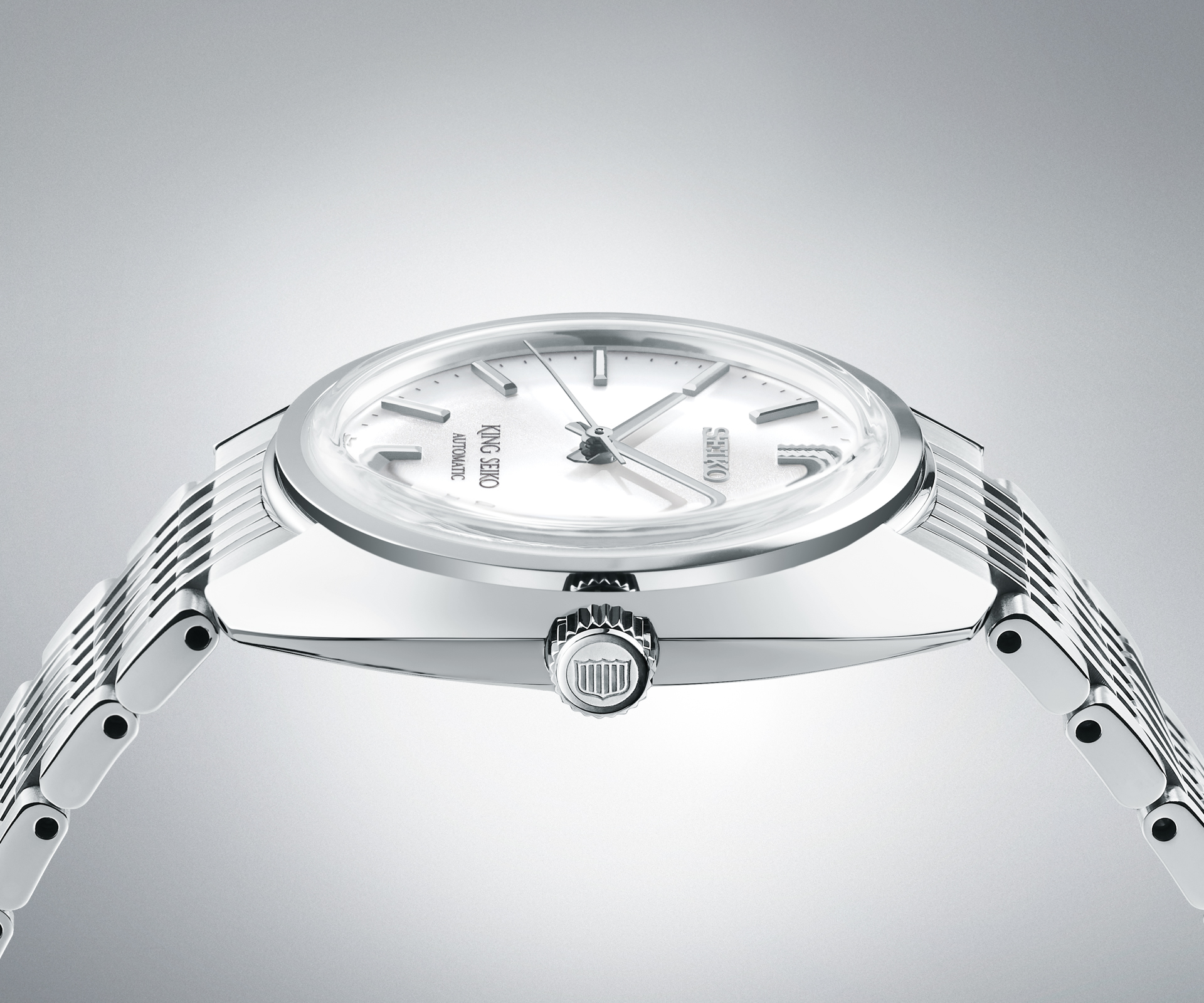 Though the series adopts the contours of the original 1969 model, it reimagines them for modern times with a rounded, box-shaped glass. Thanks to Seiko’s modern watch manufacturing techniques and the slimline Caliber 6L35, the watches achieve a svelte and comfortable thickness of 9.9mm. The watches feature a sleek multi-row bracelet with mirror-polishing and brushed finishing to achieve a quiet sparkle when it reflects light. The King Seiko “shield” appears on the crown and caseback, and the iconic silhouette of the original has been retained, though it has been flattened and modernized.