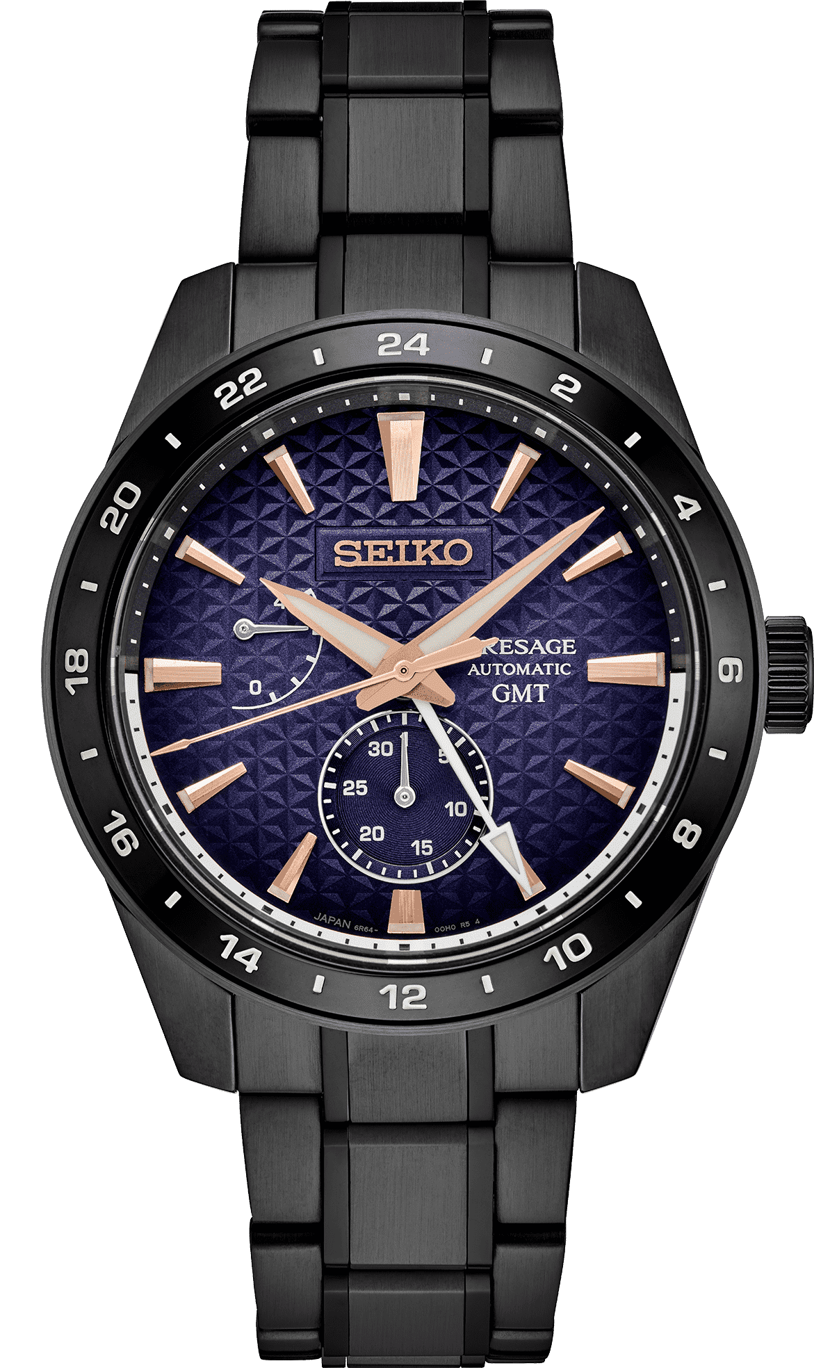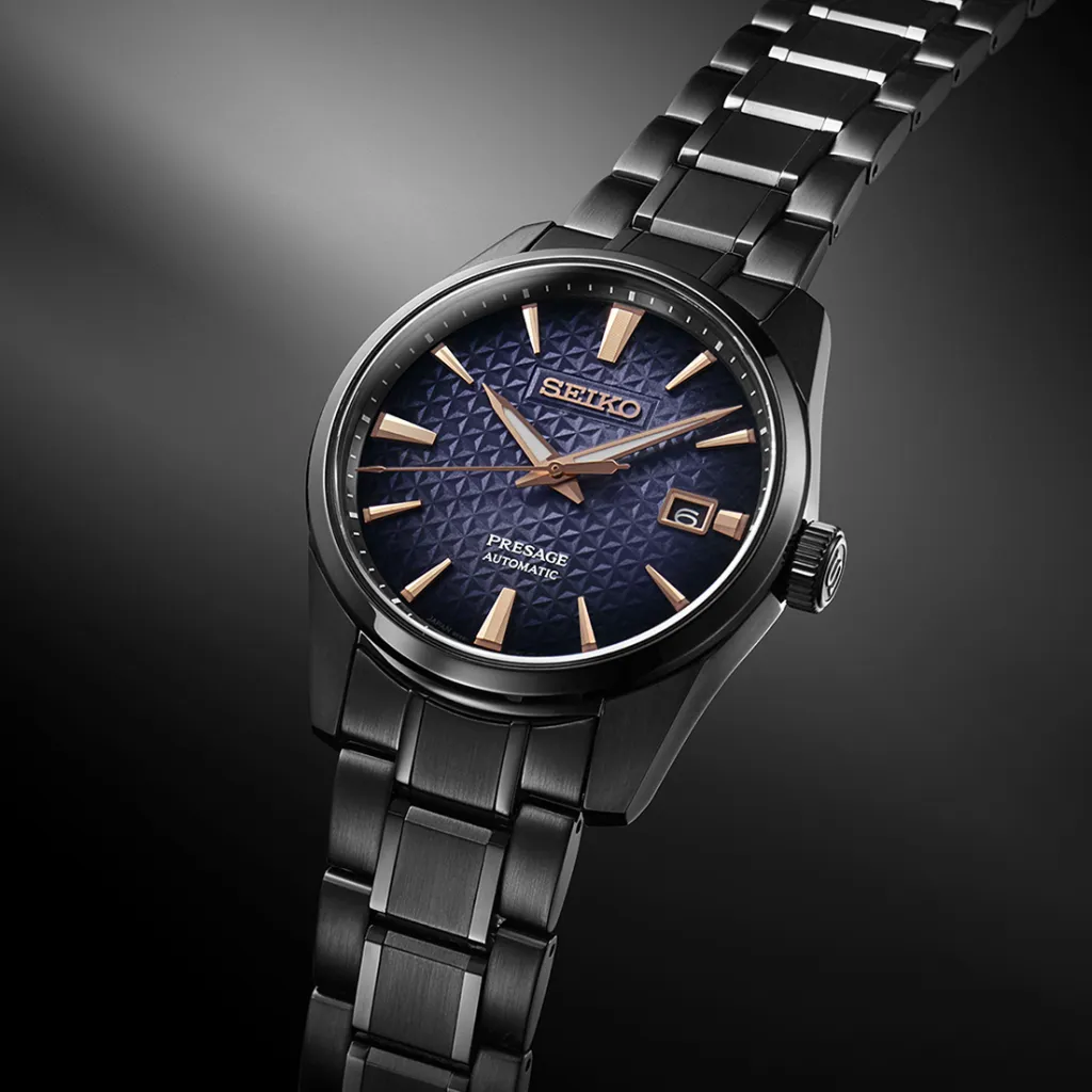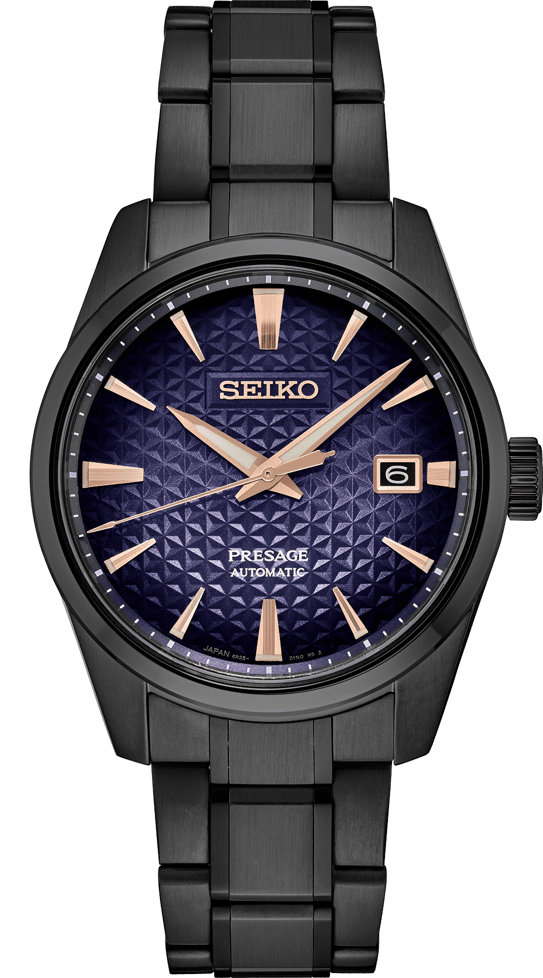The dials have a stunning gradation, with a bright center framed by a darkening perimeter. This is inspired by akebono, when the dark of night gives way to the first glimmers of dawn. The pink gold hands and indexes represent the morning sun, shining through the sky with the first glimmers of light. The all-black case and bracelet with hard coating are reminiscent of the dawn sky, foreshadowing the day ahead.